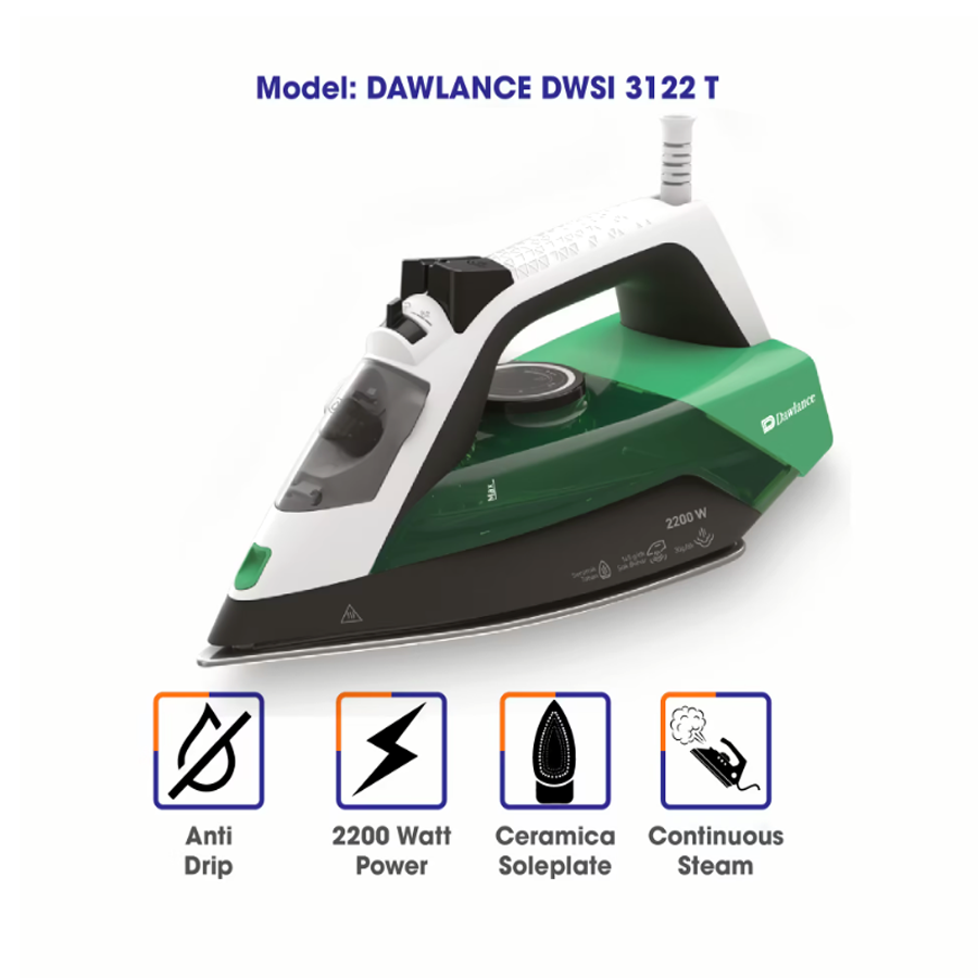 DAWLANCE STEAM IRON DWSI 3122 T 2 3 - Al Nafay Electronics - Providing Dawlance Home and kitchen Appliances all over Pakistan. It includes kitchen Appliances, Air Conditioners, Water Dispensers, Dishwashers, Microwave Ovens, LED TVs, Refrigerators & Freezers, Washing Machines, Personal Care Items and more.